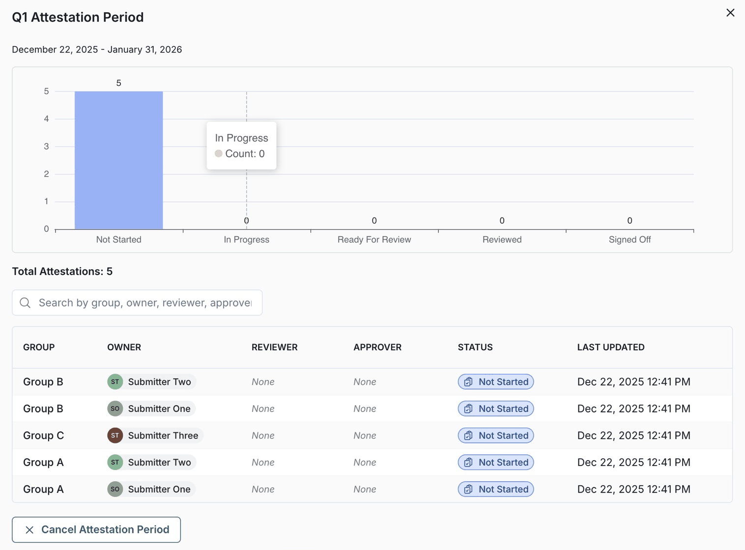 Plan your attestation periods ahead of time to ensure they can be completed on time. The start date must be today or a future date, and you cannot set a date in the past to trigger attestation retroactively.