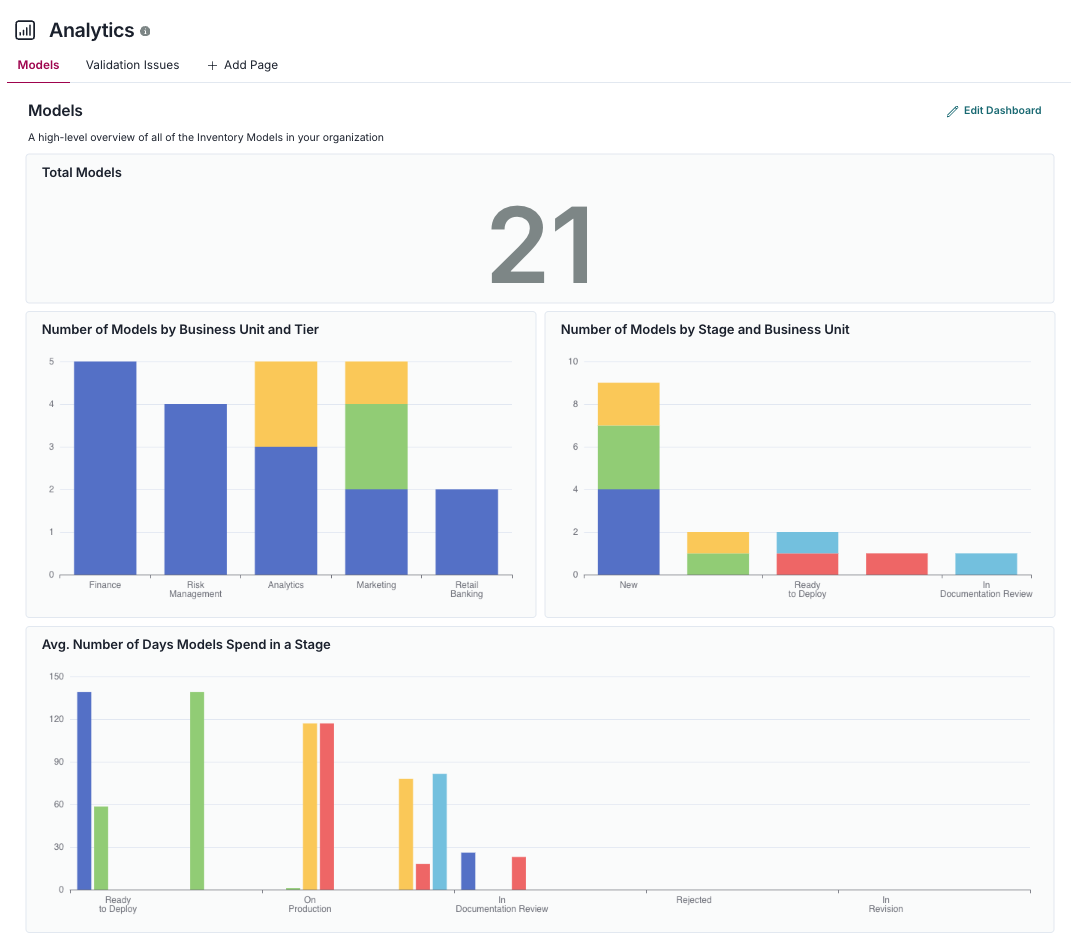 - Count of your model volume by stage5 further broken down by business unit. Assists you in pinpointing where in the organization resources may need to be focused, based on the progress and severity of artifacts.