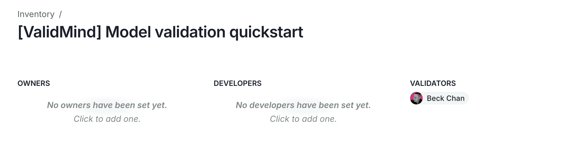 For this quickstart, you’ll register a dummy model first and assign yourself as the validator to familiarize you with the ValidMind Platform interface: