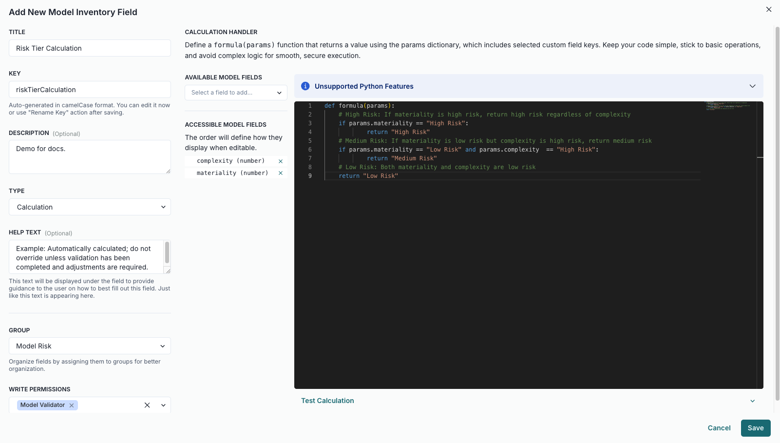 Custom model inventory fields are now more flexible than ever — introducing the ability to define a formula(params) function that automatically calculates and returns a value based on the params dictionary, which includes selected custom field keys retrieved from your other inventory model fields.