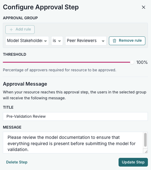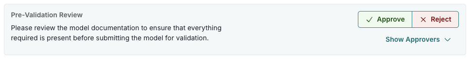 In this example, the peer reviewers model stakeholders14 assigned to the model are presented with an approval message: