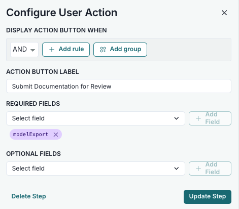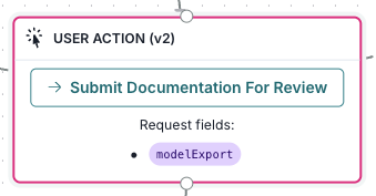 In this example, the user is presented with an action button labelled Submit Documentation For Review that requires them to include a model export in a model export attachment type field.13