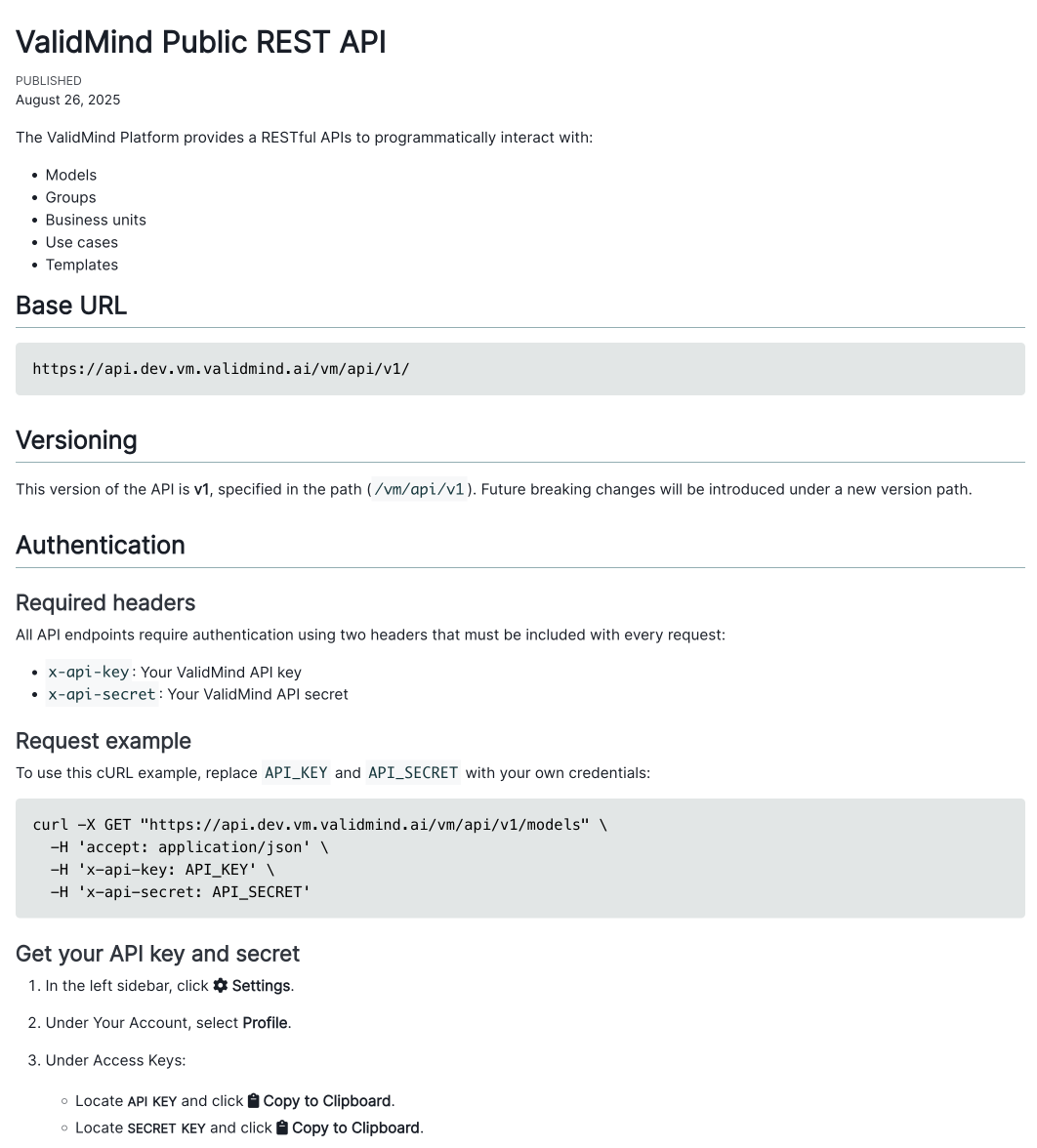 To enable you to programmatically interact with models, groups, business units, use cases, and templates, we have introduced an API reference in our documentation: ValidMind Public REST API Reference