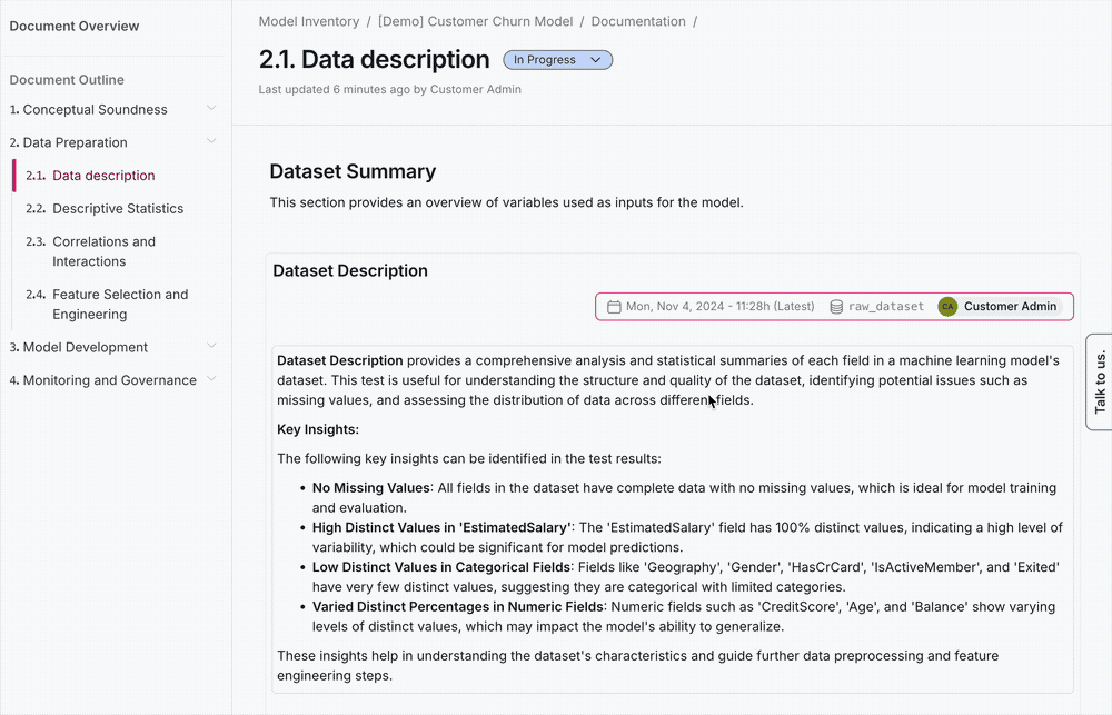 The Analytics page offers access to essential information about your model validation efforts, summarizing findings, while the Findings page facilitates efficient tracking of issues identified during model validation. Together, these pages improve your model validation workflow and simplify compliance with organizational standards and regulatory requirements.